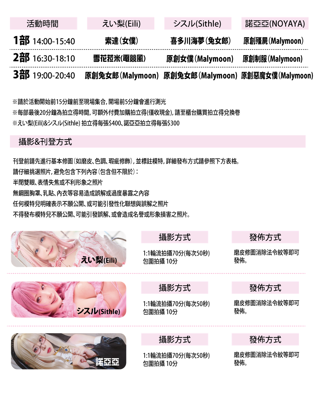 8.本活動僅允許靜態照片拍攝;未經主辦方與模特兒事前書面同意,不得錄製影像或音檔,亦不得將靜態素材轉為任何動態形式使用。